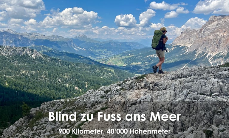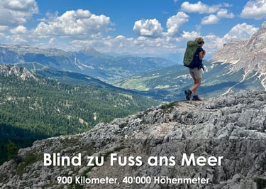Grenzen sind Kopfsache: Trotz Martinas plötzlicher fast vollständiger Erblindung machte sie sich zusammen mit Martin zu Fuss auf den Weg von Zürich nach Triest. Ihre 3-monatige Fernwanderung über die Alpen und durch die Dolomiten wird schliesslich zu weit mehr als einem Wanderabenteuer. Ein Vortrag, der, umrahmt von Bergpanoramen, noch eine ganz andere Geschichte erzählt: Eine Geschichte übers Weitergehen.